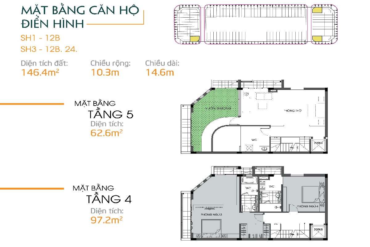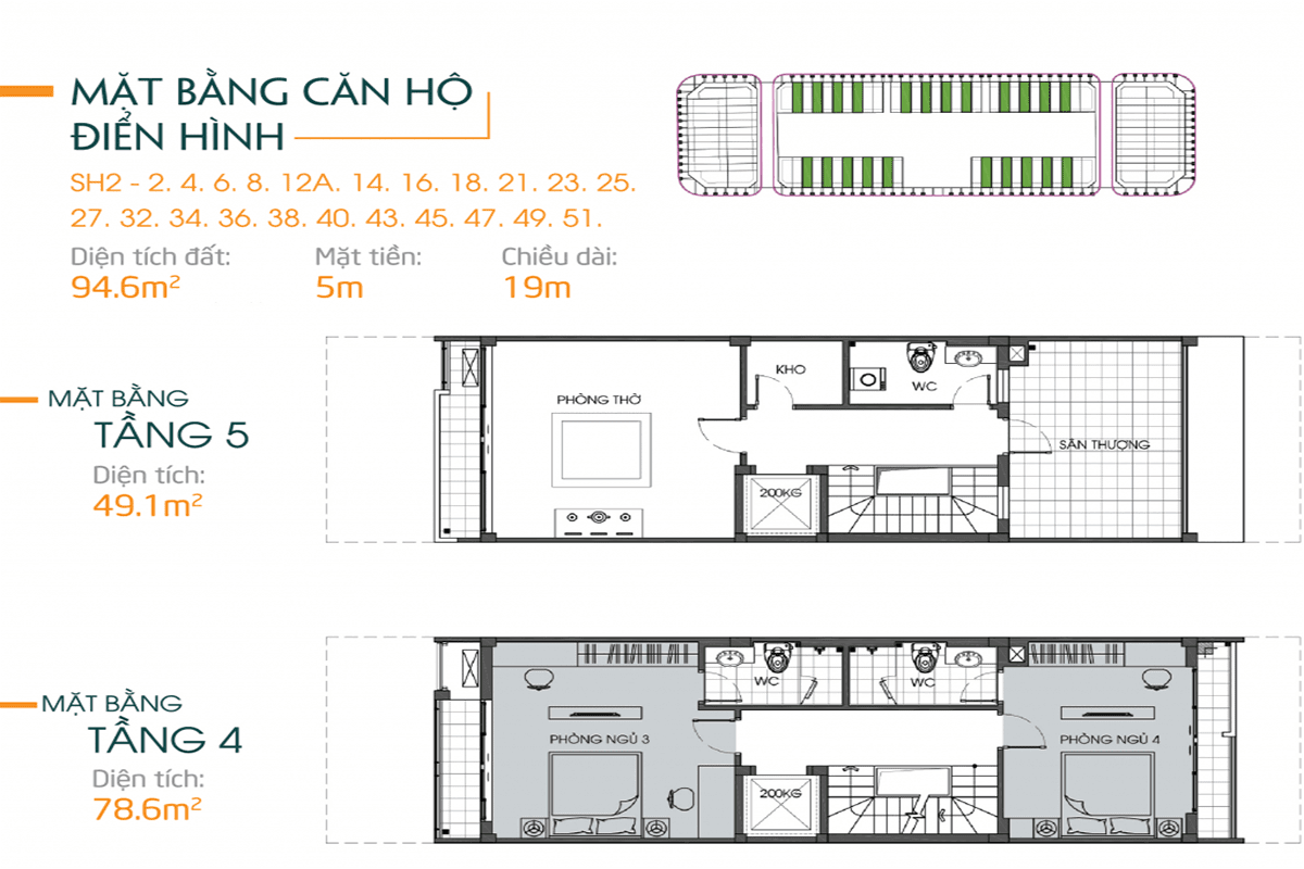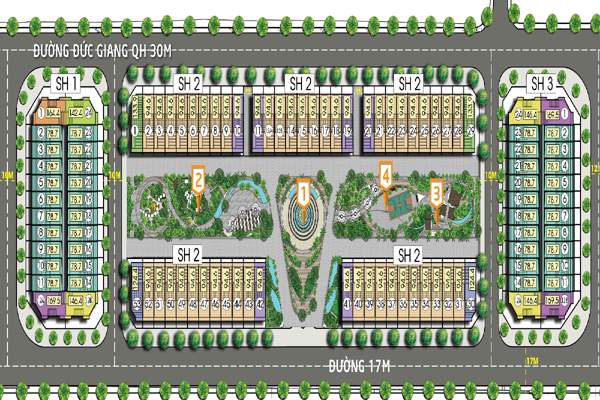 Diện tích đất: 78.7m2 ,94,6m 2( căn tiêu chuẩn). Từ 124,4– 133,9 m2 (căn góc).