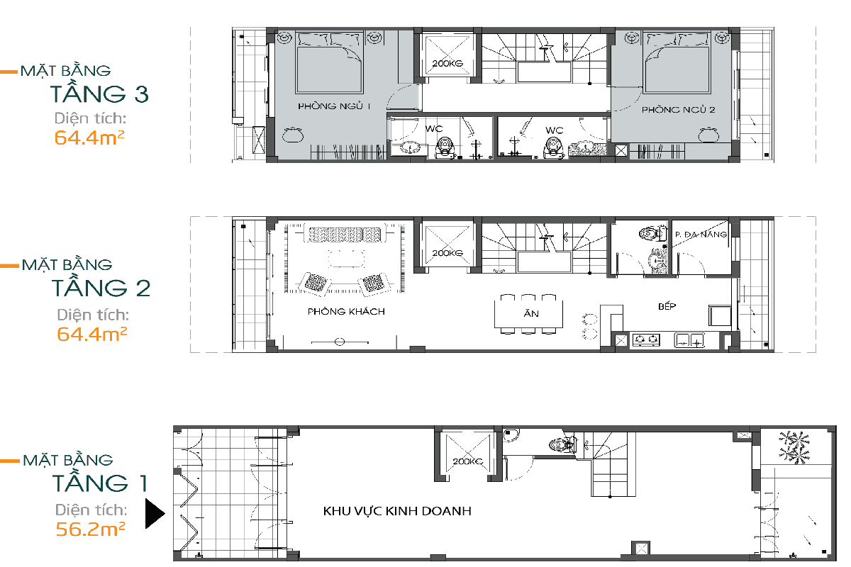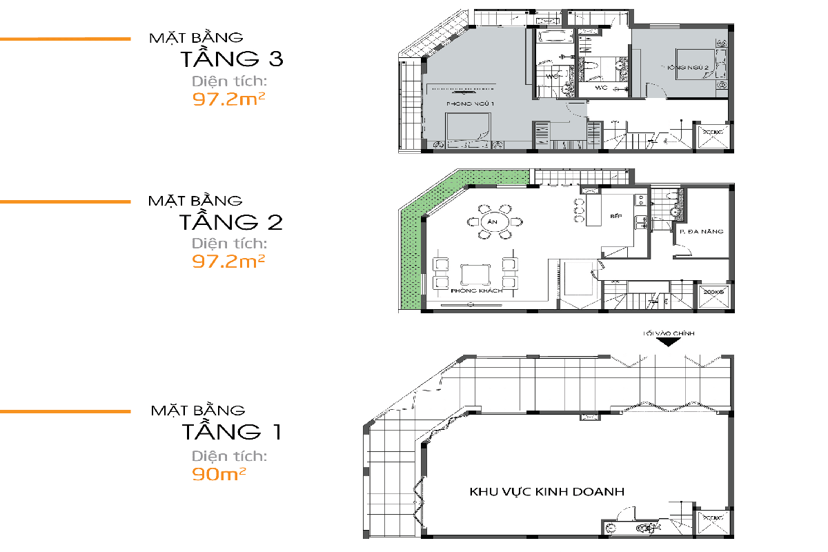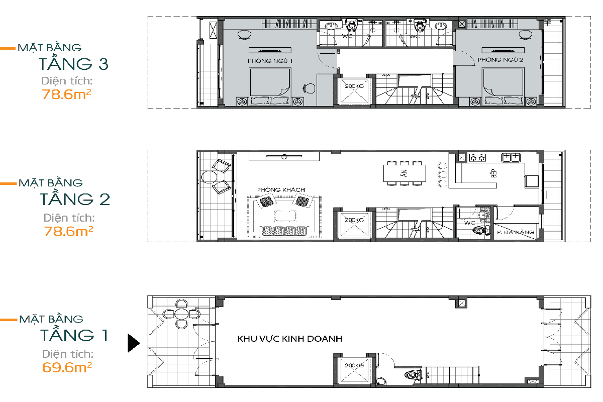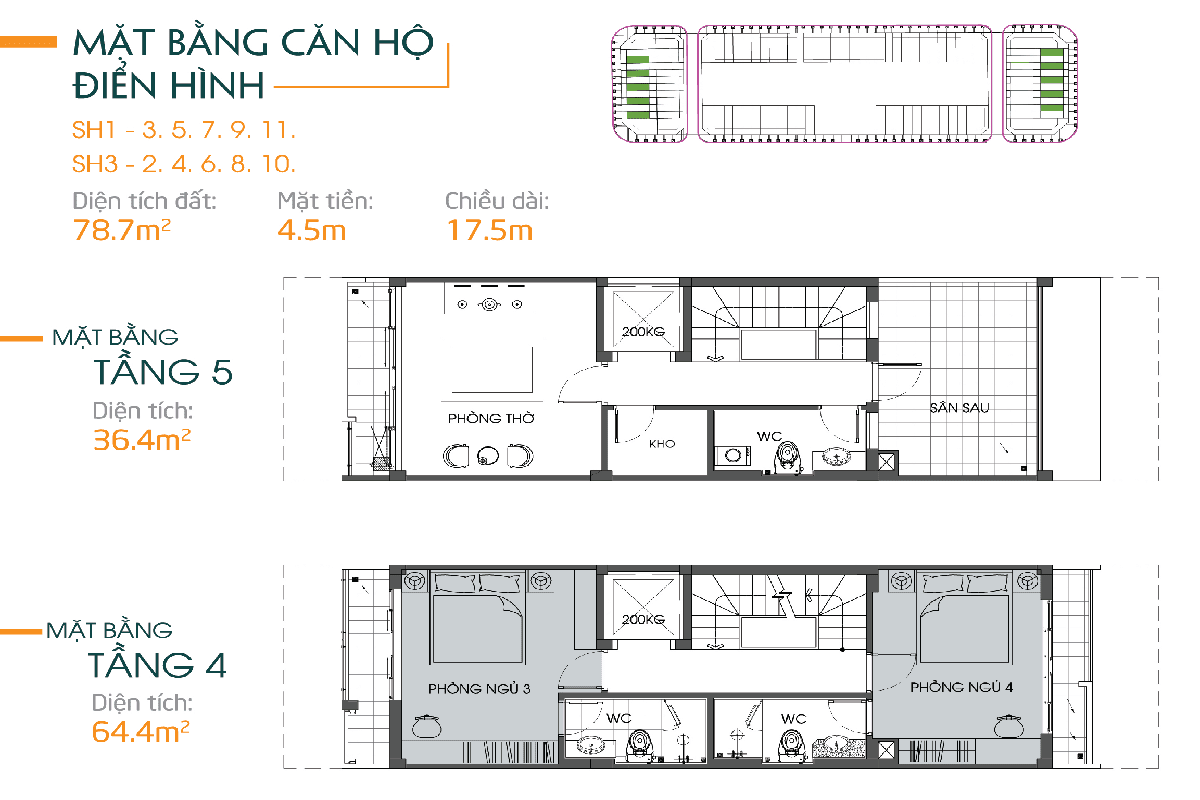 Diện tích đất: 78.7m2 ,94,6m 2( căn tiêu chuẩn). Từ 124,4– 133,9 m2 (căn góc).